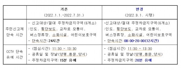 또한, 기존 불법 주·정차 주민신고제는 24시간 365일 단속 유예 없이 상시 운영됐으나, 군에서 운영 중인 CCTV 단속 운영시간과 상이해 단속원과 신고자 모두 혼선이 있었다.