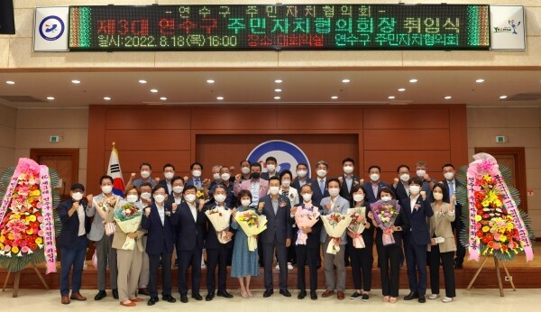 지난 7월 주민자치협의회 정기회의를 통해 새롭게 선출된 제3대 김영채 협의회장의 취임을 축하하기 위해 이재호 연수구청장과 편용대 연수구의회 의장을 비롯한 많은 사람들이 참석해 이날 취임식 자리를 빛냈다.
