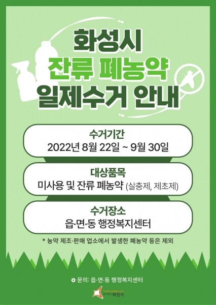폐농약을 보관 중인 시민은 용기째로 밀봉해 수거기간 내에 가까운 읍면동 행정복지센터를 방문하면 된다.