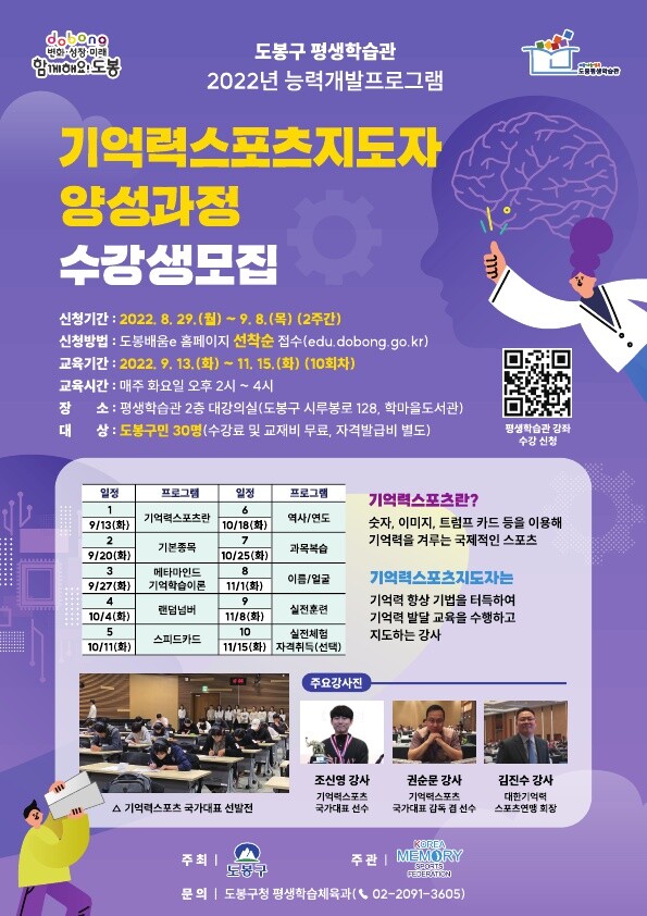 ‘기억력스포츠지도자 양성과정’은 9월 13일부터 11월 15일까지 주 1회, 화요일 오후 2시부터 4시까지 총 10회에 걸쳐 도봉구 평생학습관 2층 대강의실에서 진행된다.