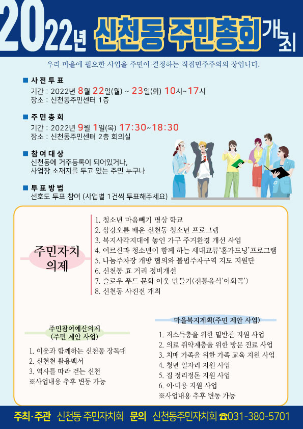 신천동 주민총회는 당일 주민자치회 활동보고를 시작으로 안건별 사업 설명, 주민의견 수렴을 위한 질의 및 토론, 현장투표로 진행된다.
