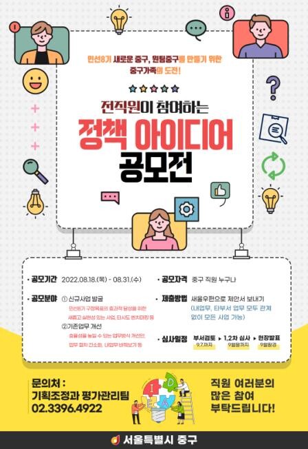 이번 공모는 민선8기 구정비전인 ‘하나되는 중구, 함께하는 중구를 만드는 굿 아이디어’라는 주제로 신규사업 발굴 기존업무 개선 등 2개 분야로 나누어 진행된다.