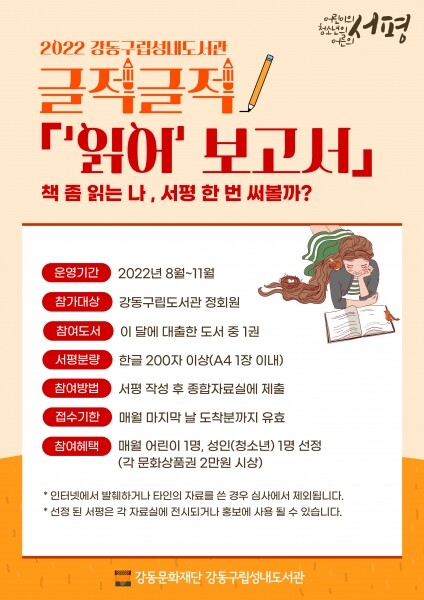 또한, 우수작으로 선정된 서평은 강동구립성내도서관 종합자료실에 한 달간 전시할 계획이라고 전했다.