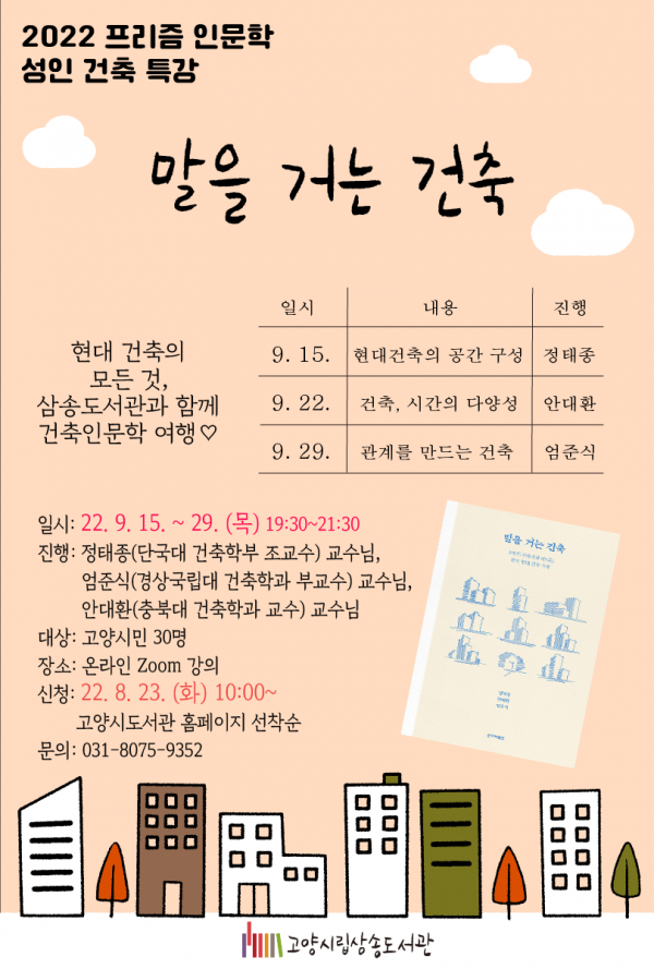 9월 8일부터 9월 29일까지 매주 목요일 저녁에 온라인으로 진행되는 ‘말을 거는 건축’은 8월 23일부터 도서관 홈페이지에서 신청할 수 있다.