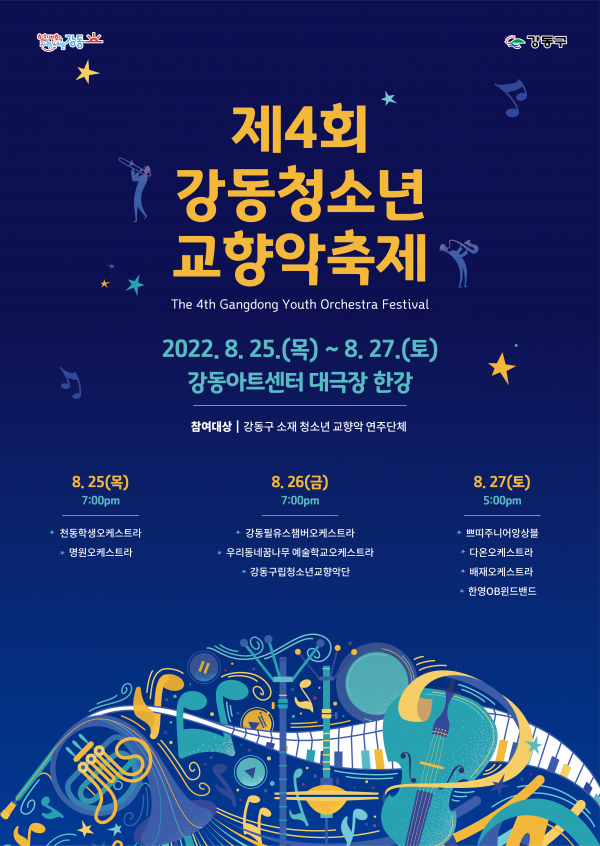 강동구가 2017년에 시작해 올해로 4회째를 맞는 ‘강동청소년교향악 축제’는 클래식 연주자를 꿈꾸는 관내 청소년들이 그동안 갈고 닦은 연주 실력을 펼치며 무대경험을 쌓을 수 있는 클래식음악 교류의 장이다.
