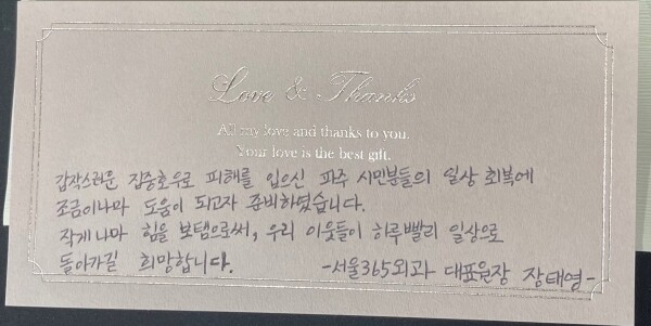 야당동 운정3동에 위치한 서울365외과의원의 장태영 원장은 “갑작스러운 집중 호우로 피해를 입으신 파주 시민분들에게 조금이나마 도움이 되고자 준비했다”며 “하루빨리 일상으로 돌아가길 희망한다”며 손수 쓴 편지와 함께 성금을 기탁했다.