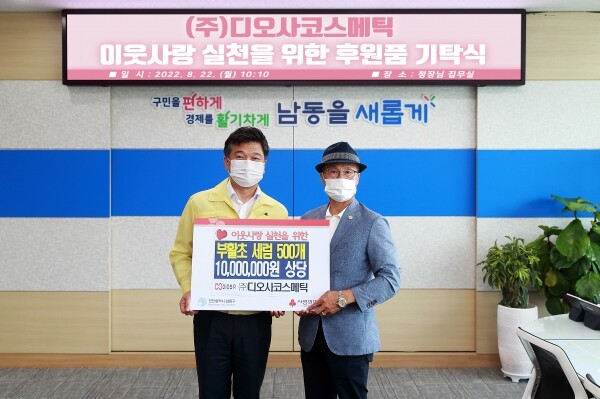 박종효 남동구청장은 “어려운 경제 상황에서도 이웃을 위해 손길을 내밀어주신 ㈜디오사코스메틱에 감사드리며 기탁해주신 후원품은 도움의 손길이 필요한 분에게 전달될 수 있도록 노력하겠다”고 밝혔다.