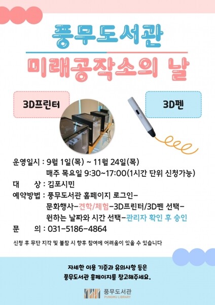 그동안 풍무도서관은 ‘다같이 코딩 교실’, ‘2022 이야기가 있는 코딩’ 등의 코딩 강의와 3D펜, 3D프린터를 활용한 강의를 다수 진행했으며 특히 지난 7월 한 달간은 미래공작소의 날 시범운영을 통해 시민 24명이 장비를 체험한 후 도출된 의견과 이용 절차 및 안전 수칙 등에 관한 검토 등을 거쳐 본격적인 개방을 시행하게 됐다.