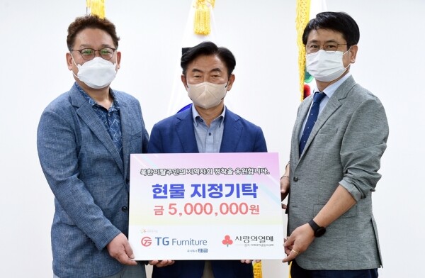 사회적기업 주식회사 태금이 기탁한 현물 지원금은 관내 북한이탈주민 7가정에 책상·책꽂이·슬라이드 장·의자·캐비닛·책장 7세트를 전달됐다.