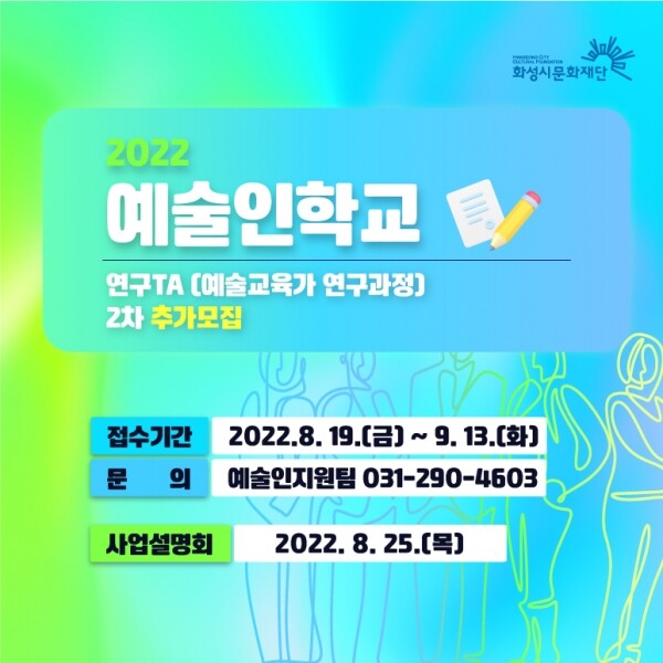화성시문화재단 관계자는 “문화예술교육에 관심이 있고 성장하고자 하는 예술교육가 그룹은 연구과정에 참여해 전문 컨설팅을 통해 예술교육가로서 성장하기를 바란다”고 전했다.