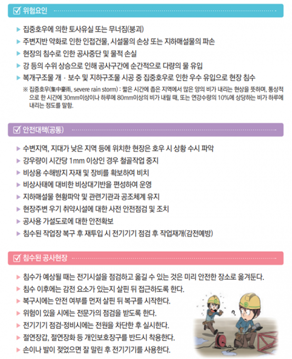 또한, 초소규모 건설현장은 무료 기술지도 사업을 적극적으로 활용하고 재해위험성이 높은 건설현장소장 및 안전관리자를 대상으로 집중호우 사고사례 및 자율안전점검표 안내·교육 중이니 적극적으로 참여해 달라고 했다.