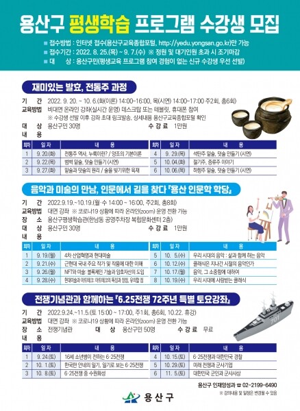 그밖에도 9월 용산구 평생학습 프로그램으로 재미있는 발효, 전통주 과정 전쟁기념관과 함께하는 ‘6.25전쟁 72주년 특별 토요강좌’ 등이 진행된다.