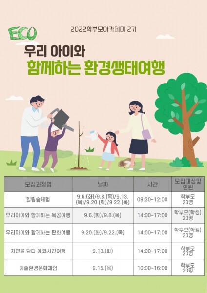 모집과정은 힐링숲체험, 아이와 함께하는 목공여행, 아이와 함께하는 판화여행, 자연을 담다 에코사진 여행, 예술환경문화체험 등 5개 과정이다.