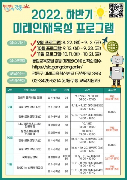 이 프로그램들은 강동구 미래교육혁신센터에서 열리며 국제통상교육 찾아가는 발명체험교실 창의력문제해결 캠프 디지털콘텐츠디자인 전공체험 융합소프트웨어 전공체험 핑퐁 로봇코딩 등 6개 프로그램으로 진행된다.