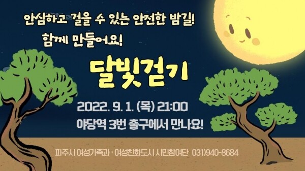 달빛걷기는 2022년 양성평등 주간을 기념해 실시하는 행사로 9월 1일 저녁 9시에 여성친화도시 시민참여단과 함께 진행된다.