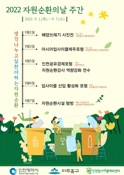 ‘생각 나누고 실천 더하는 자원순환’이라는 주제로 인천업사이클에코센터에서 해양쓰레기 사진전시전 개최를 시작으로 인천공유경제포럼, 자원순환강사 역량강화 연수, 업사이클 산업 활성화 포럼, 시민 대상 자원순환시설 탐방, 에코센터 전시해설 등을 진행한다.
