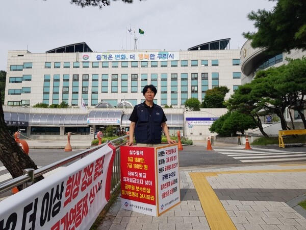피켓을 들고 시청 앞에 선 박운평 위원장은 “공무원 보수 인상에 물가연동제를 실시해야 한다”며 “허울뿐인 국민 봉사자를 요구하고 힘들 때는 고통 분담을 강요한다 그러려면 생활임금부터 보장하라”고 주장했다.