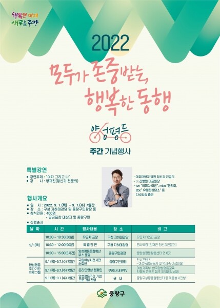 류경기 중랑구청장은 “양성평등주간을 맞아 성평등의 의미와 가치에 대해 모두가 함께 고민하고 공유할 수 있는 뜻깊은 시간을 마련했다”며 “모두가 존중받고 행복한 동행이라는 주제에 걸맞은 중랑구를 만들도록 최선을 다하겠다”고 말했다.