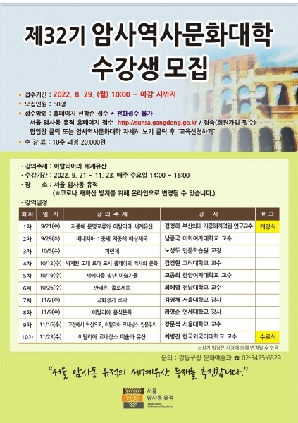 ‘제32기 암사역사문화대학-이탈리아의 세계유산’은 오는 29일부터 수강생 50명을 선착순으로 모집하며 20세 이상 성인이라면 누구나 신청할 수 있다.