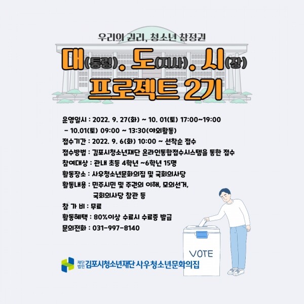 김포시청소년재단 조성훈 수련관장은 “미래 유권자인 청소년들이 민주시민에 대해 이해하고 바른 참정권을 실천할 수 있도록 다양한 프로그램을 진행하겠다”고 전했다.