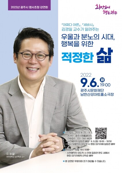 이번 강연은 김경일 아주대 심리학과 교수가 ‘우울과 분노의 시대, 행복을 위한 적정한 삶’이라는 주제로 이야기할 예정이다.