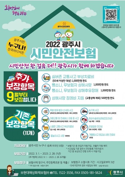 이에 따라 광주시 시민안전보험은 기존 보장 개시한 폭발·화재·산사태·붕괴사고와 대중교통 이용 중 일어난 상해사망사고 등 11개 보장항목과 이번에 추가되는 4개 항목을 포함해 총 15개 항목으로 확대됐다.