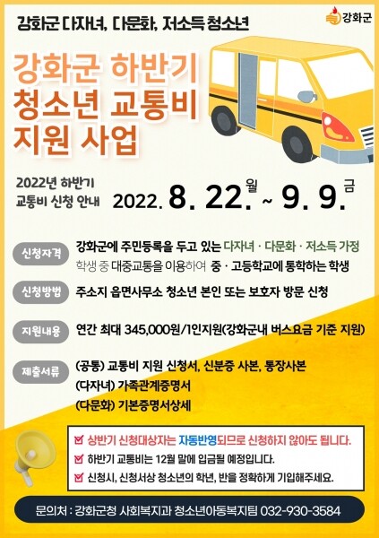 이에 군은 인천광역시 최초로 지난 2020년부터 안정된 학업지원을 위한 청소년 교통비를 지원을 하고 있다.