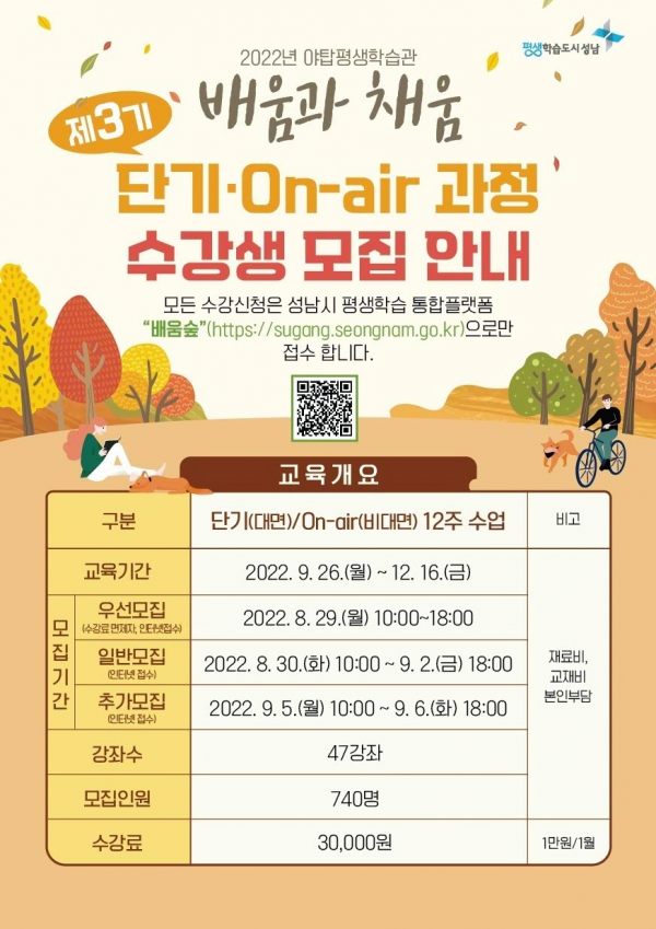 배움과 채움 과정을 수강하려는 18세 이상의 성남시민은 기간 내 성남시 평생학습 통합플랫폼 ‘배움숲’을 접속해 선착순 신청하면 된다.