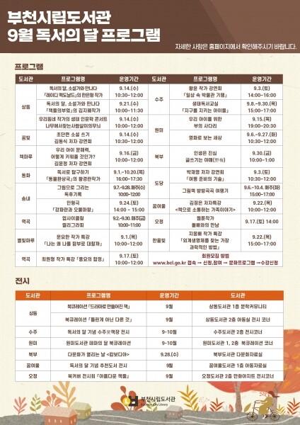 송내도서관은 나만의 캐릭터 그리기를 통해 그림 작가 체험 활동을 할 수 있는 ‘그림으로 그리는 독후 기록’ 강연이 9월 7일부터 매주 수요일 한 달 동안 진행되며 온 가족을 위한 인형극 ‘강파란과 오물마왕’이 9월 4일 진행된다.