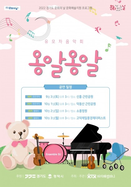 [뉴스써치] 평택시는 오는 31일부터 9월4일까지 8월 ‘경기도 문화의 날’ 주간을 맞아 영·유아 및 가족 대상 ‘유모차음악회’, 초등학교 구성원 대상 ‘마수리 교실 극장’, 어르신들을 위한 ‘민요공연’ 등을 경기도와 평택시가 공동주최하고 지역 문화예술단체 주관으로 시민들을 찾아간다고 25일 밝혔다.