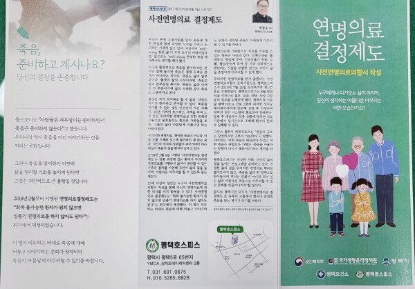 평택보건소 관계자는 “생의 말기의 품위 있는 죽음을 미리 준비하며 환자 본인의 의사가 존중받는 문화가 조성될 수 있도록 최선을 다하겠다”고 말하며 사전연명의료의향서에 대한 자세한 문의사항은 평택 호스피스 기관 또는 국민건강보험공단 평택지사로 연락하면 된다고 전했다.