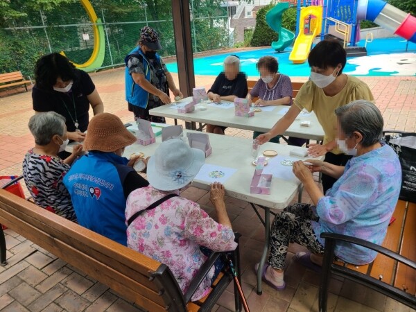 어르신들은 공예 만들기 강사의 설명을 들으면서 본인이 원하는 모양을 직접 조립해보면서 다양한 문양의 컵홀더 만들기에 참여했다.