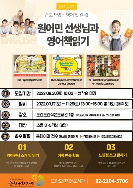 오진이 금천문화재단 대표이사는 “초등학생들이 원어민 강사와 함께 책을 따라 읽으며 영어를 친숙하고 재밌게 느낄 수 있는 기회”며 “영어뿐만 아니라 독서 습관을 들이고 독해력도 높일 수 있는 유익한 시간이 되길 바란다”고 전했다.