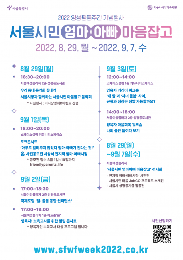 2022년 양성평등주간 기념행사 ‘서울시민 엄마·아빠 마음잡고’ 관련한 자세한 내용은 홈페이지에서 확인할 수 있다.