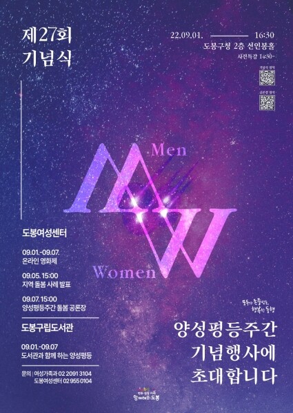 이 밖에도 성평등활동센터 양성평등 도서 전시 및 부스 운영 도서관과 함께하는 양성평등이 양성평등주간 동안 도봉여성센터와 도봉구립도서관에서 열린다.
