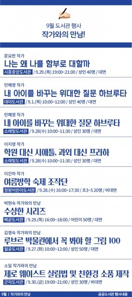 중앙도서관에서는 ‘나는 왜 나를 함부로 대할까’의 문요한 작가와의 만남이 열리고 대야도서관에서는 ‘내 아이를 바꾸는 위대한 질문 하브루타’의 민혜영 작가와의 만남을 마련했다.