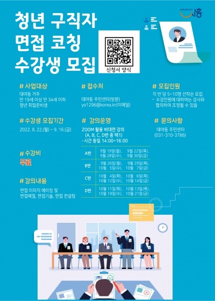 온라인 화상회의 프로그램 줌을 통해 진행되는 ‘청년구직자 면접 코칭’ 프로그램은 오는 9월 19일부터 10월 21일까지 운영되며 만 19세 이상 만 34세 이하의 대야동 주민이라면 누구나 참여할 수 있다.