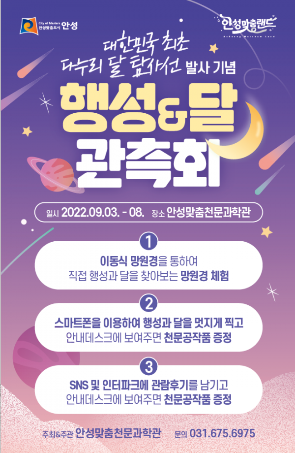 행성 달 관측프로그램은 행사 기간 내에 매일 20시, 오후 9시에 진행되며 이용요금은 성인 4,000원 청소년 2,000원이고 안성시민은 50% 할인을 받을 수 있다.