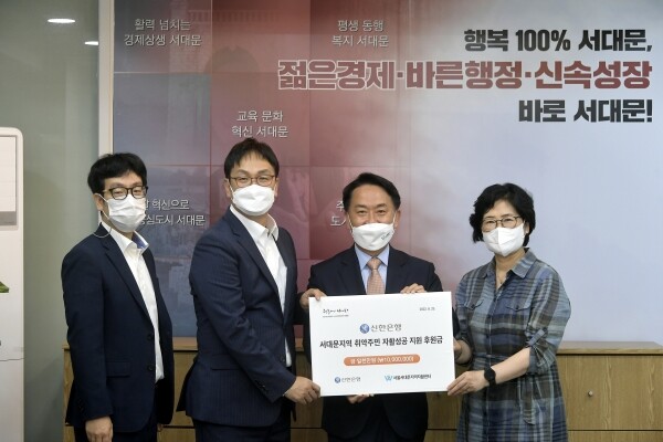 신한은행 신촌지점은 ‘금융의 힘으로 세상을 이롭게 한다’는 모토 아래 활발한 사회공헌활동을 전개하고 있으며 이의 일환으로 저소득 주민들의 자활 성공을 지원하고자 천만원을 전달했다.