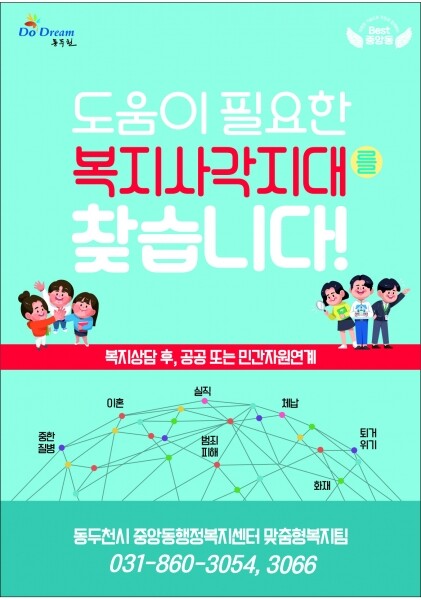 중앙동 지역사회보장협의체와 행정복지센터는 복지사각지대 포스터를 수시로 봉사하는 착한식당과 카페, 미용실, 전통시장, 공동주택, 경로당 등 관내 전역에 부착하며 복지사각지대 발굴을 요청하고 있다.
