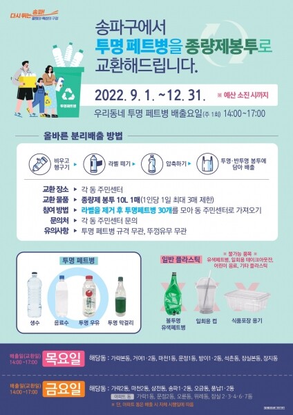 송파구 투명페트병·비닐 배출 요일은 가락본동, 거여1·2동, 마천1동, 문정1동, 방이1·2동, 석촌동, 장지동, 잠실본동의 경우 목요일이며 가락2동, 마천2동, 삼전동, 송파1?2동, 오금동, 풍납1·2동은 금요일이다.