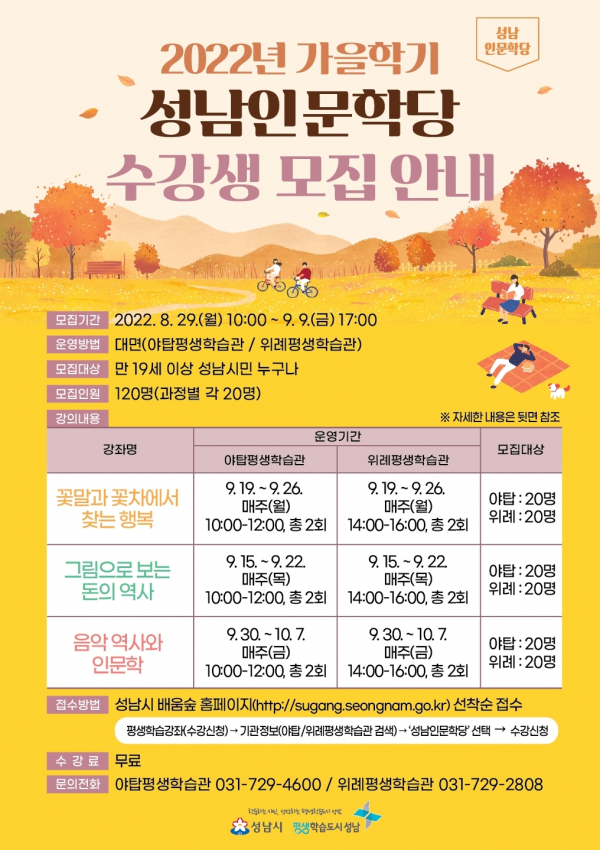 수강 신청하려면 오는 8월 29일부터 9월 9일까지 성남시 평생학습 포털 배움숲 → 야탑/위례평생학습관 → 가을학기 성남인문학당)을 통해 선착순 접수 하면 된다.