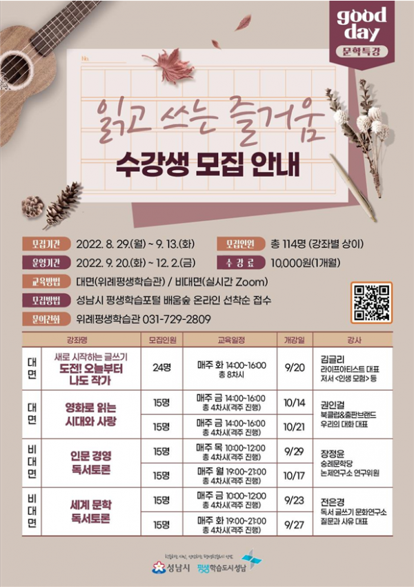 수강 신청하려면 오는 8월 29일부터 9월 13일까지 성남시 평생학습 포털 배움숲 → 위례평생학습관)을 통해 선착순 접수하면 된다.