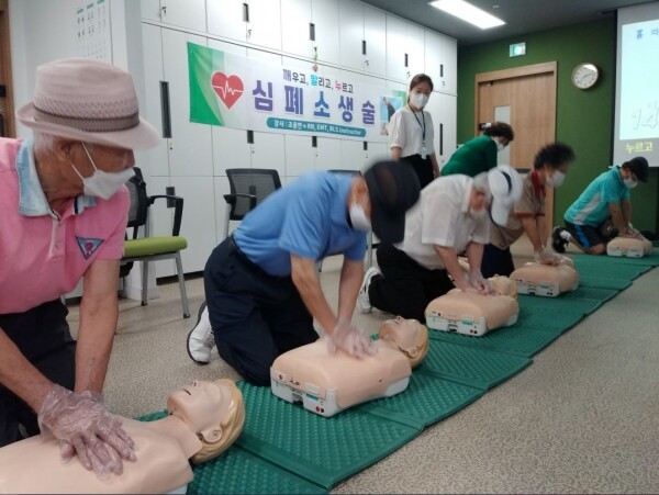 치매 가족들은 화재 발생 초기대응, 대처 방법 주택용 소방시설 중요성 소화기 사용법 심폐소생술, 응급처치법 폭염 대비 노인 건강관리 수칙 및 온열성 질환 예방법 등을 직접 실습하며 배웠다.