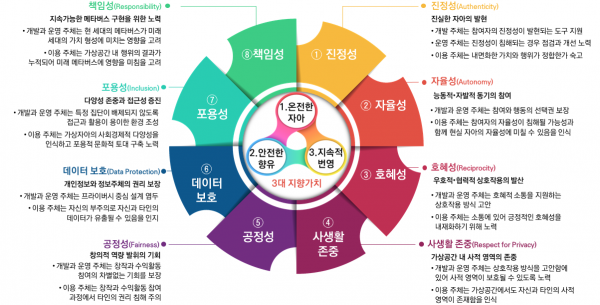 ‘확장가상세계 윤리원칙’ 연구를 주도적으로 이끈 정보통신정책연구원 문아람 연구위원은 토론회 발제자로 나서서 “확장가상세계 윤리원칙 초안은 가상자아, 몰입경험, 경제시스템 등 확장가상세계 고유한 특징에 주목해 기존 정보통신분야 윤리규범과 차별성을 고려하고 사회구성원의 자율적 노력의 기준이 될 수 있도록 보편적이면서도 실행 가능한 원칙을 제시하고자 했다”고 말하며 “창의와 혁신의 확장가상세계 생태계를 위한 ‘3대 지향가치’와 이를 실현하기 위한 ‘8대 실천원칙’을 마련했다”고 확장가상세계 윤리원칙 초안의 핵심 내용을 소개했다.