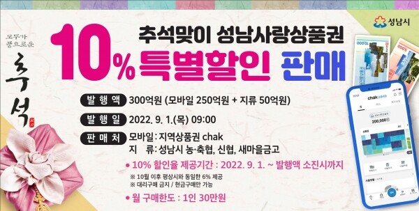 할인율 10%면 현금 9000원을 내고 1만원권 성남사랑상품권을 살 수 있으며 월 구매 한도는 30만원이다.