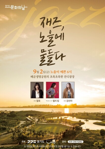 오는 9월 2일 오후 6시부터 7시 30분까지 총 90분간 열리는 ‘재즈 노을에 물들다’ 공연은 아름다운 노을을 감상할 수 있는 장소로 소문나, 평소에도 많은 시민들이 즐겨 찾는 배곧생명공원 잔디광장에서 개최된다이번 공연에는 국내 최고 재즈 실력자로 꼽히는 보컬 ‘말로’를 포함해 색소포니스트 ‘릴리킴’, 보컬 ‘강선아’ 등이 출연해, 쉽게 접하지 못했던 품격 높은 재즈 공연을 만끽할 수 있다.