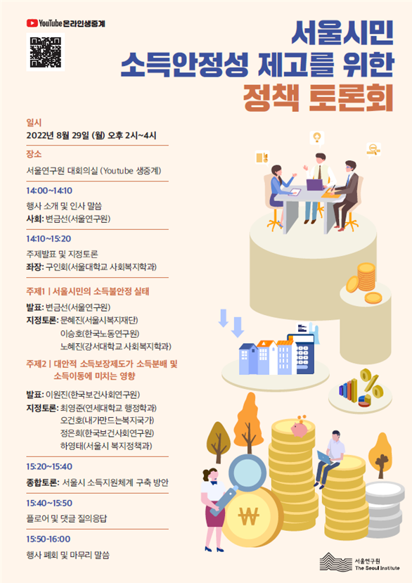 이번 정책토론회는 서울연구원의 ‘서울형 소득지원체계 구축 방안 연구’의 연구결과를 공유하고 학계 전문가와 정책 실무자가 함께 서울형 소득지원체계 구축을 위한 정책 대안을 모색하는 자리이다.