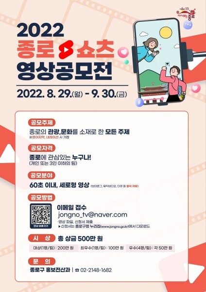 종로의 매력을 짧고 특색 있게 담아낸 영상을 찾는 ‘2022 종로 쇼츠 영상 공모전’이다.