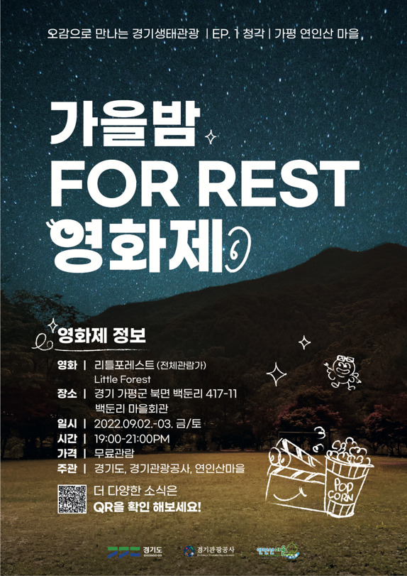 최용훈 경기도 관광과장은 “코로나 확산과 폭우, 더위로 지친 도민분들께서 마음을 달래실 수 있도록 숲속에서 즐기는 야외 영화제를 준비했다”며 “경기도 생태관광지에서 자연도 느끼고 편안한 휴식을 취하실 수 있길 바란다”고 말했다.